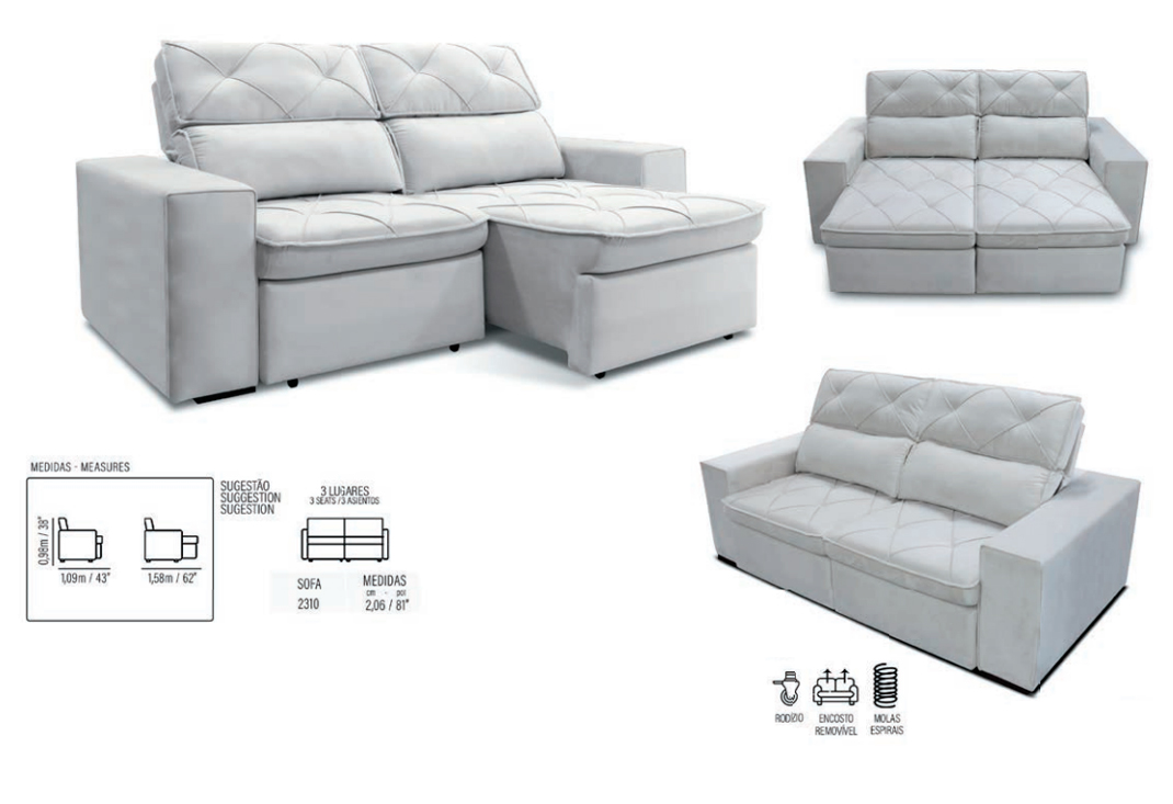 Com estrutura em madeira aparelhada de eucalipto e almofadas fixas com espuma D28 Soft, persintas elásticas e molas espirais.