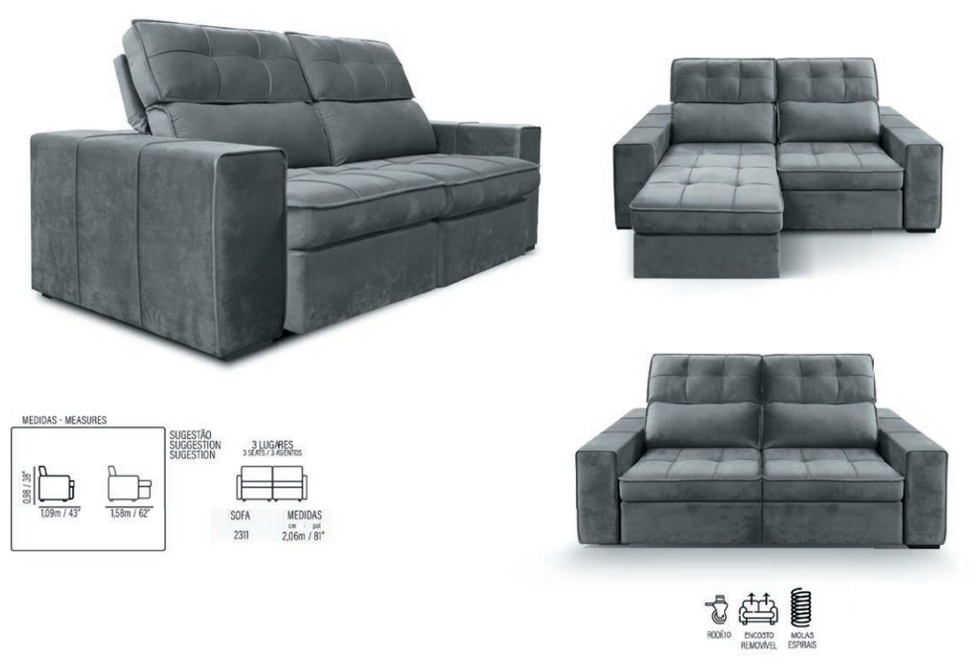 Com estrutura em madeira aparelhada de eucalipto e almofadas fixas com espuma D28 Soft, persintas elásticas e molas espirais.